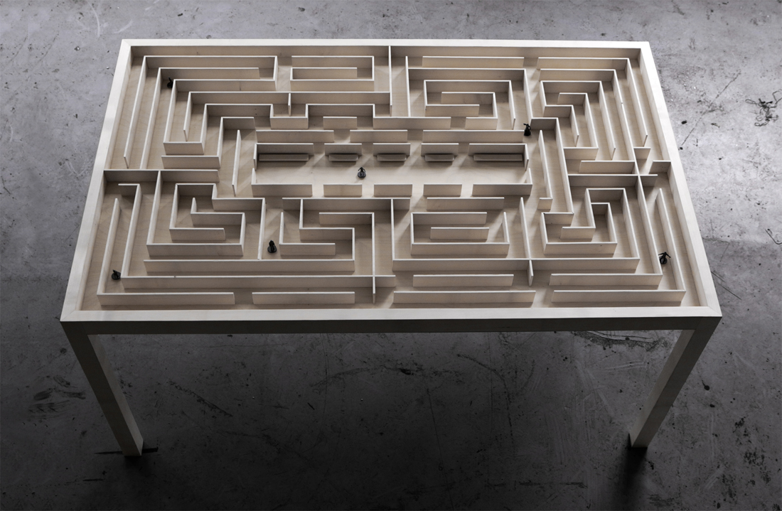 The Labyrinth Table by designer and craftsman Benjamin Nordsmark shows as a banal object such as a table, can acquire an extra dimension. In this case, Benjamin created a universe of a labyrinth inside the table’s top, allowing for its users to interact with the piece.