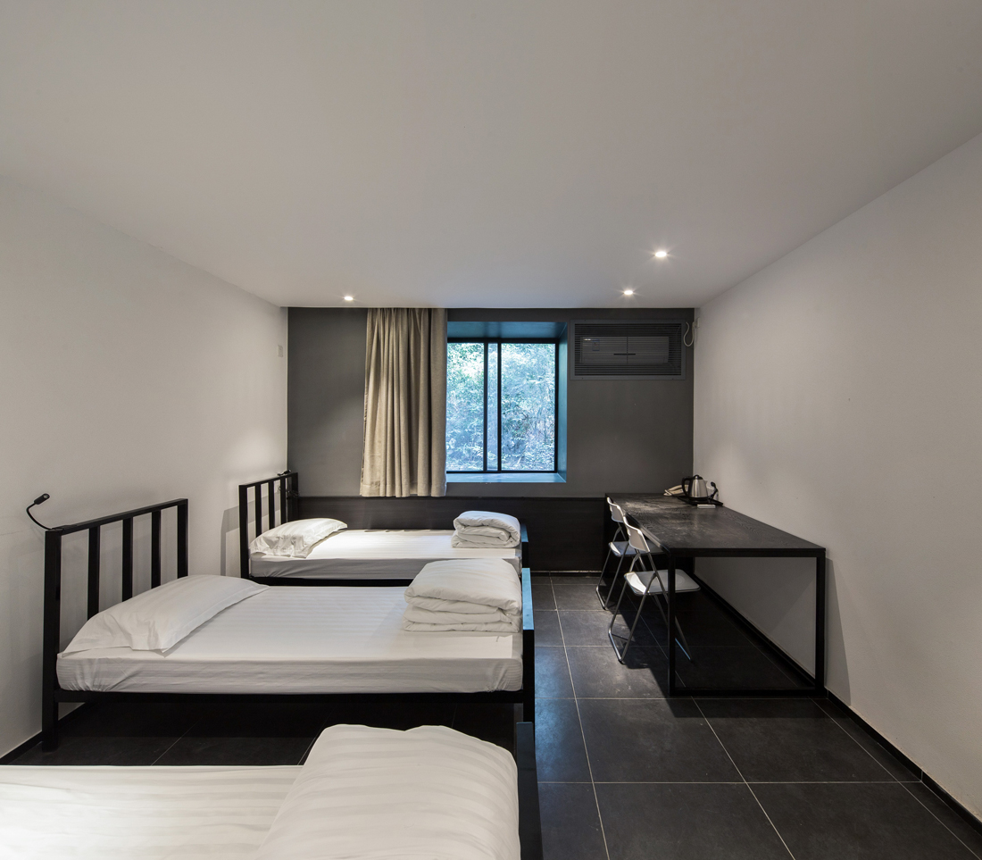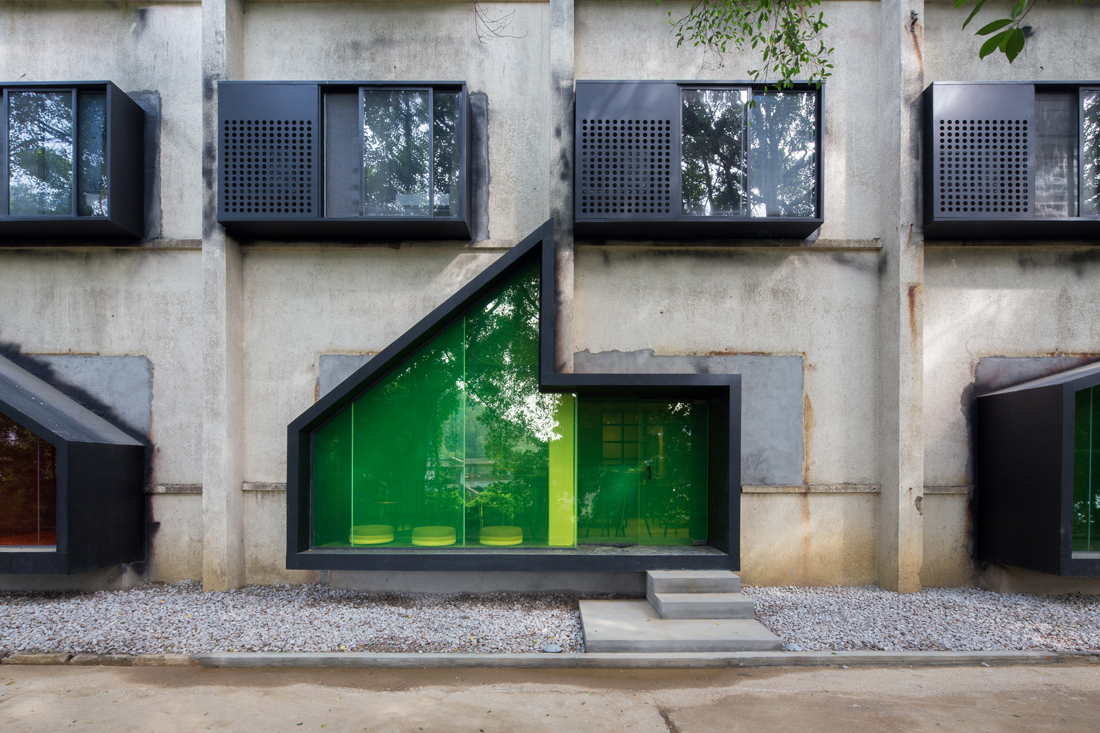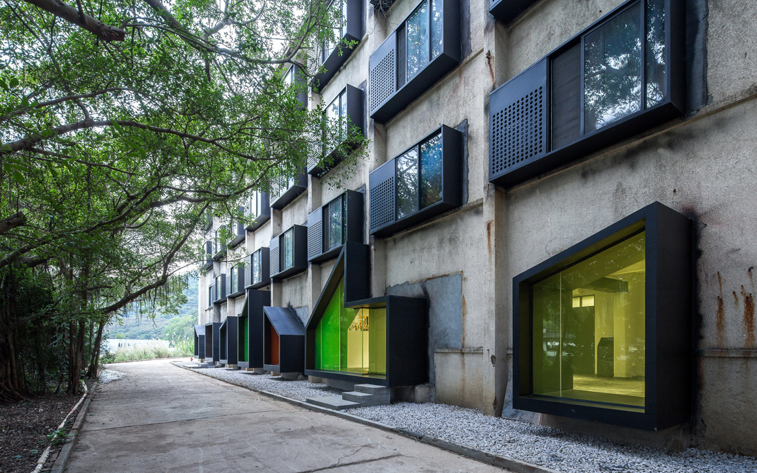 The iD Town Youth Hotel is located in Shenzhen, China, and occupies a building where before functioned a dorm for the workers of a factory, in a period of industrial prosperity in that area.