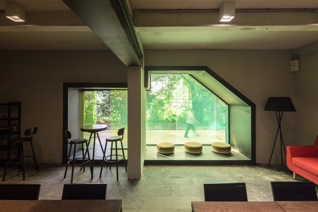 Existing characteristics of the building were kept such as the cement finishing, found in both the exterior and interior of iD Town. On the façade, frames made of steel amplify the windows in order to provoke a closer connection with the surrounding nature. The common services, such as reception and social areas, function on the ground floor; the dorms and rooms occupy two floors and only suffered small alterations.