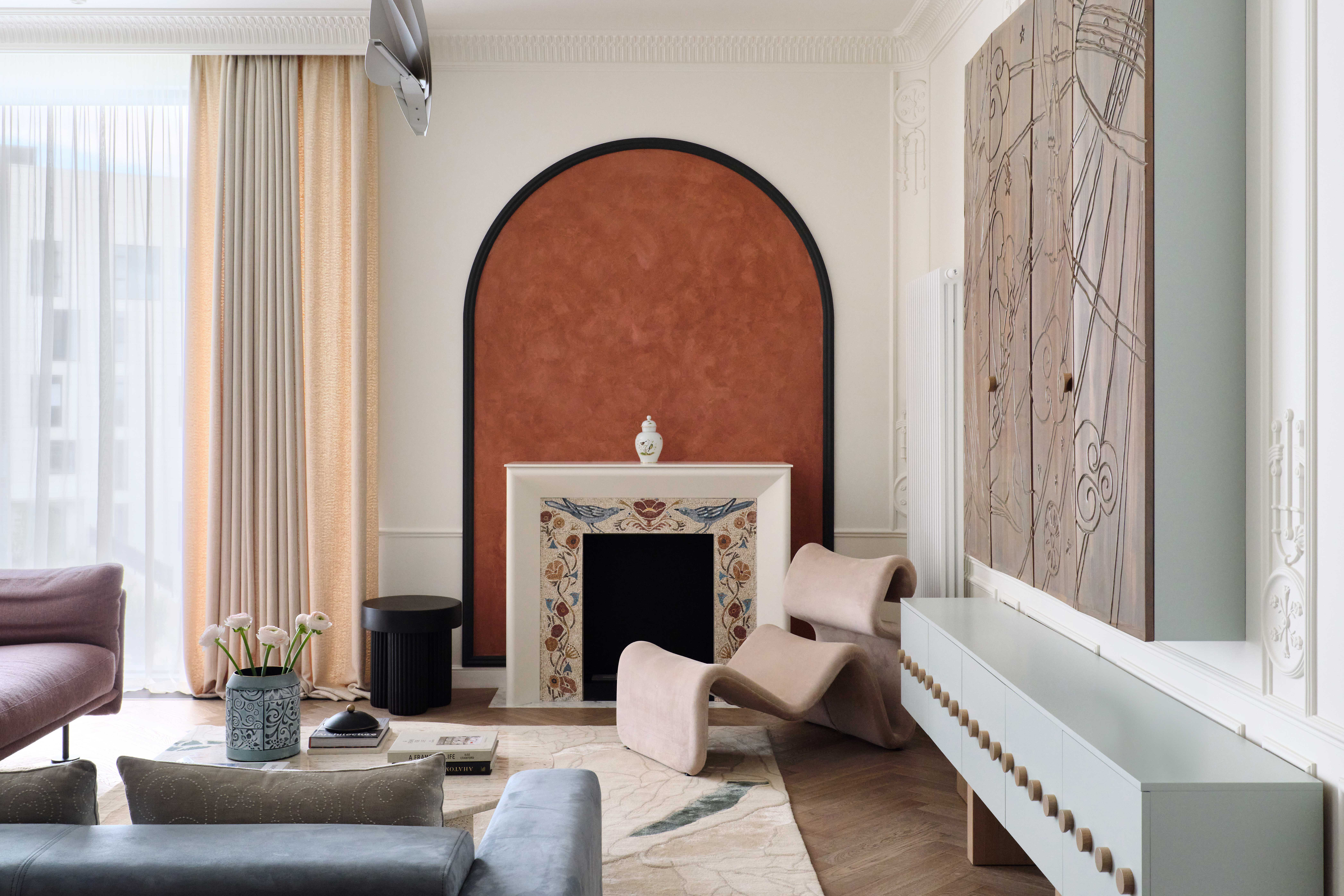 Na sala de estar, a lareira em mosaico, da autoria do artista Art Oskolok, com pássaros azuis e papoilas em flor – numa alusão à cultura do Cazaquistão – está rodeada por uma moldura em arco colorida, criando contraste e equilíbrio. “A lareira tinha de ser um ponto focal ousado, convidativo e quente. Foi assim que surgiu a cor vermelha – como um cenário para uma peça tão marcante”.